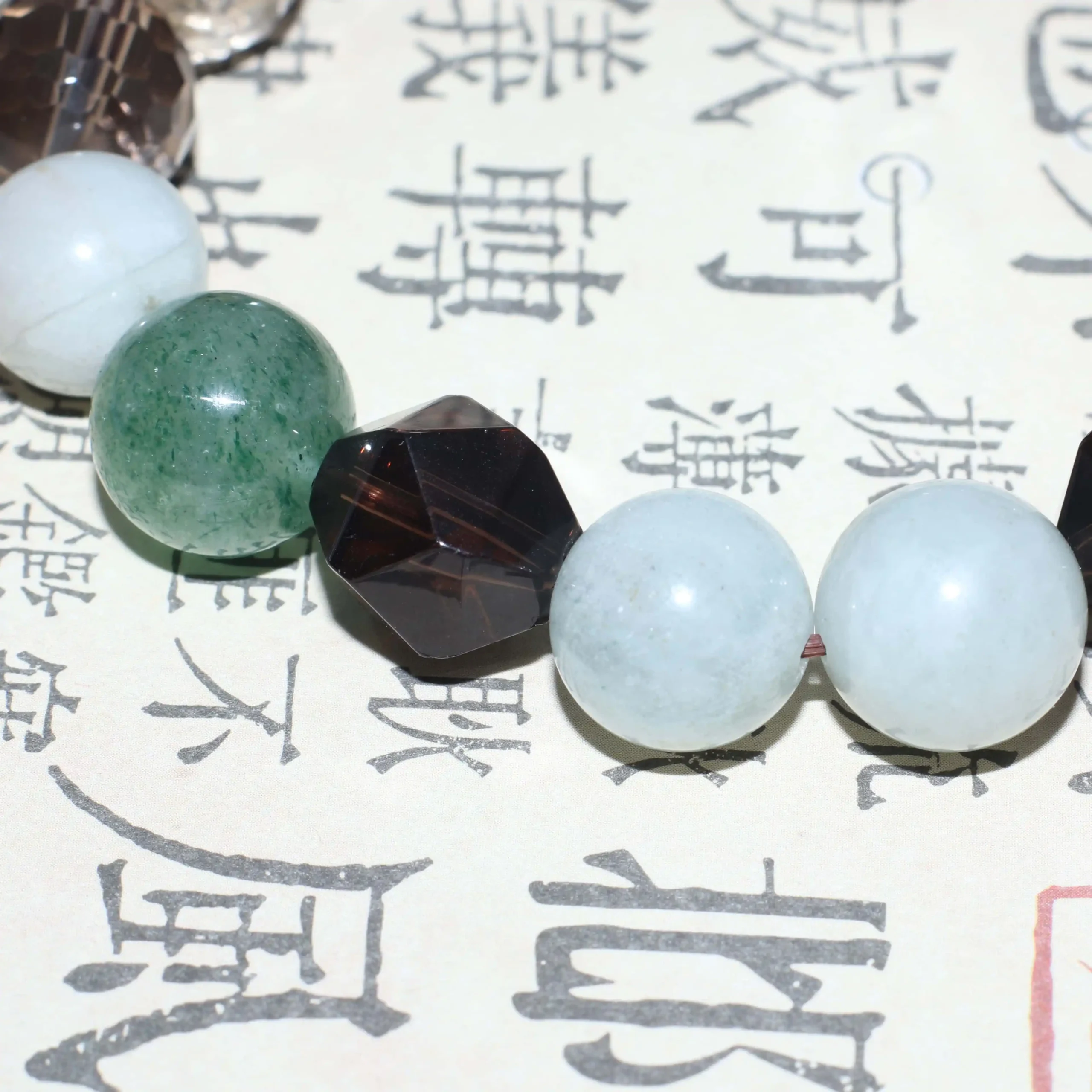 Aurora Serenity – Inspired by the Tranquility of the Northern Lights Drawing inspiration from the serene flow of the aurora, this bracelet unites the grounding calm of Island Agate, the vitality of Green Strawberry Quartz, the protective strength of Smoky Quartz, and the spiritual radiance of Moonstone. Together, these stones soothe emotions, purify energy, and balance mind and body—bringing a sense of serenity and deep spiritual clarity, like the quiet brilliance of the aurora across the night sky.